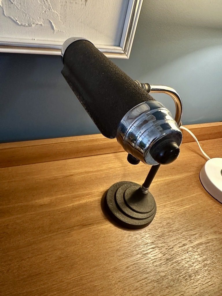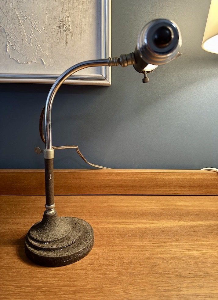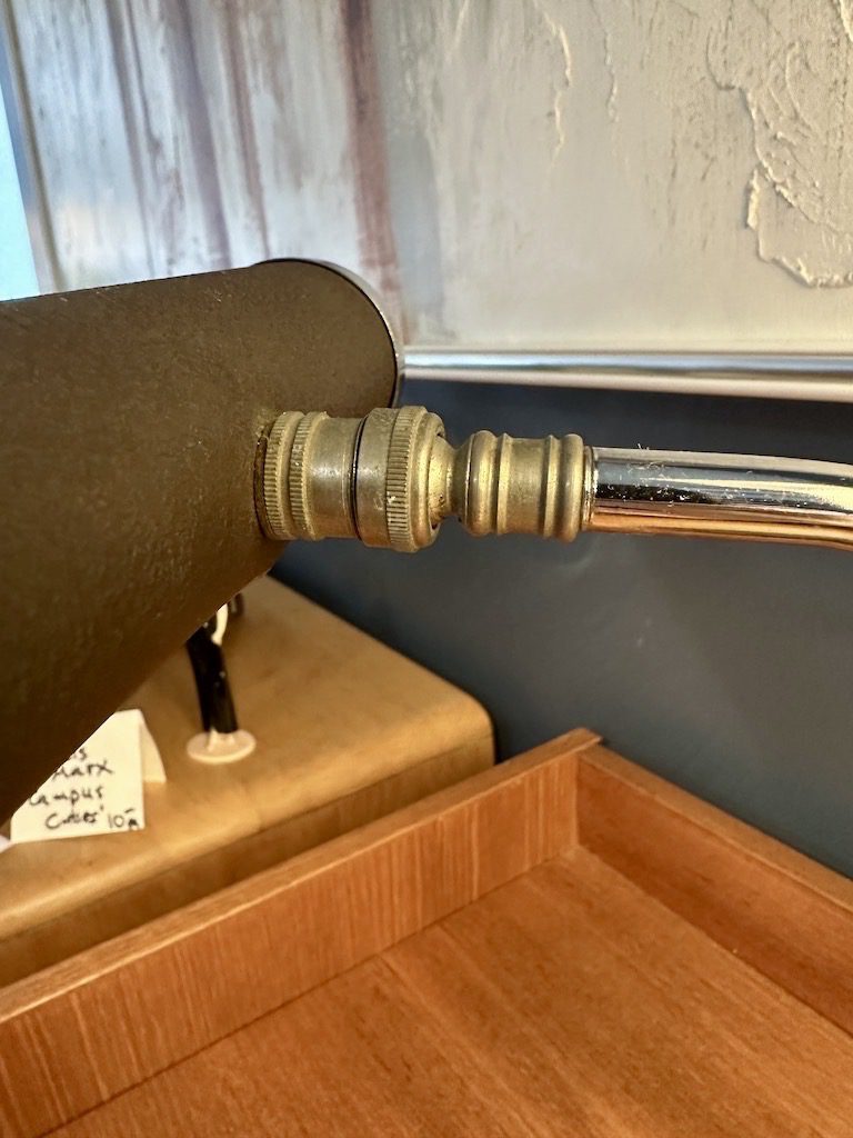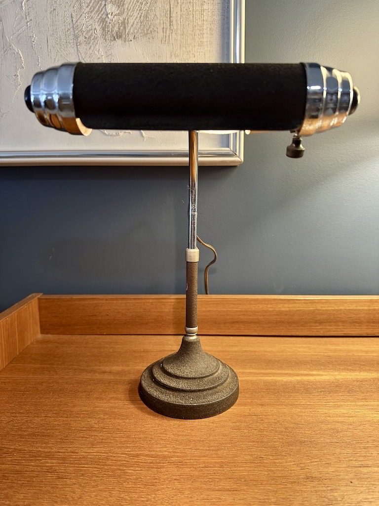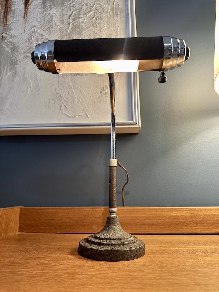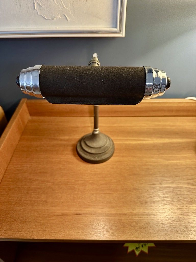 Mid-Century Bankers Lamp from Radionic Trans Co. made between 40s and 60s. Lamp features chrome end caps, Bakelite ends, textured paint and steel. Arm is adjustable up and down and the head pivots