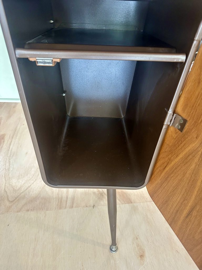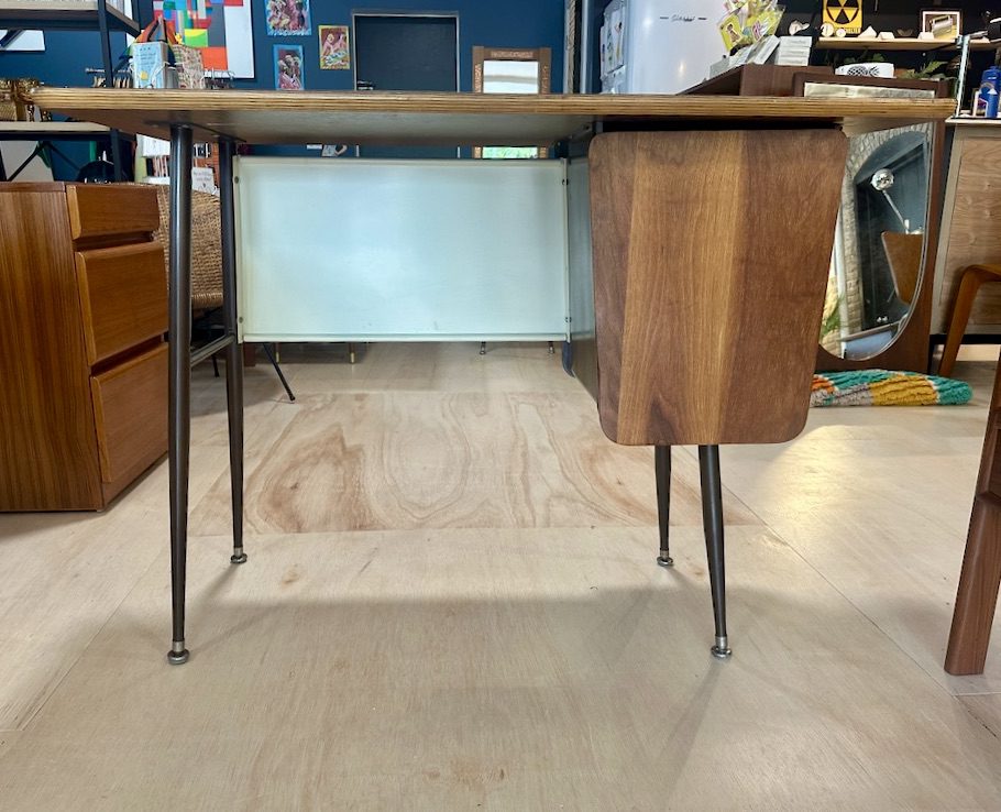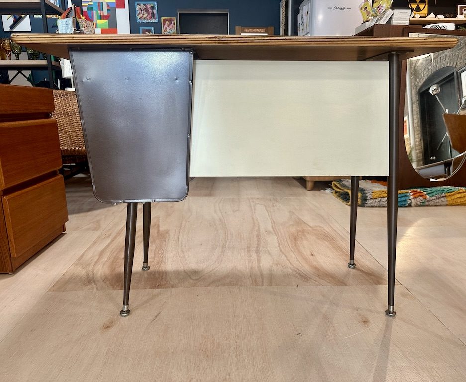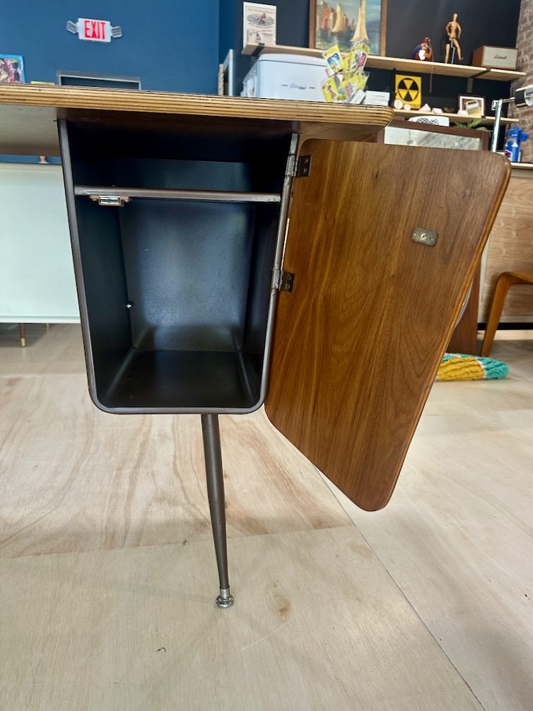 This is a great desk straight out of a 1950s classroom. Sturdy with nice walnut hinged door to hide belongings and a nearly indestructible faux wood formica top.
