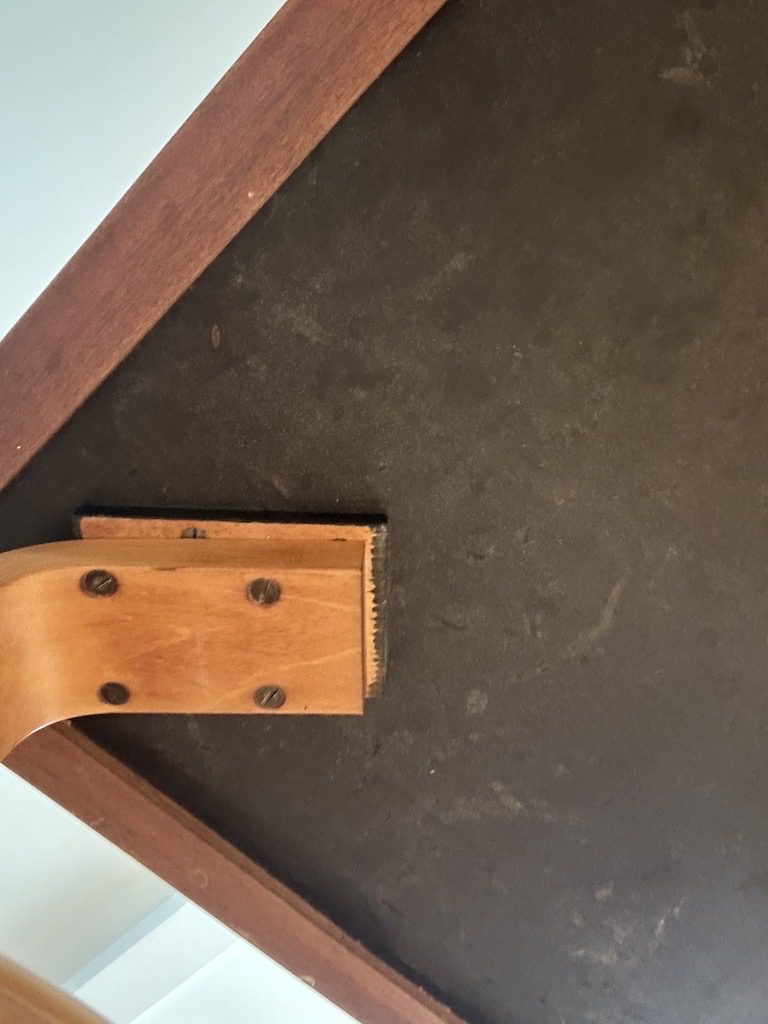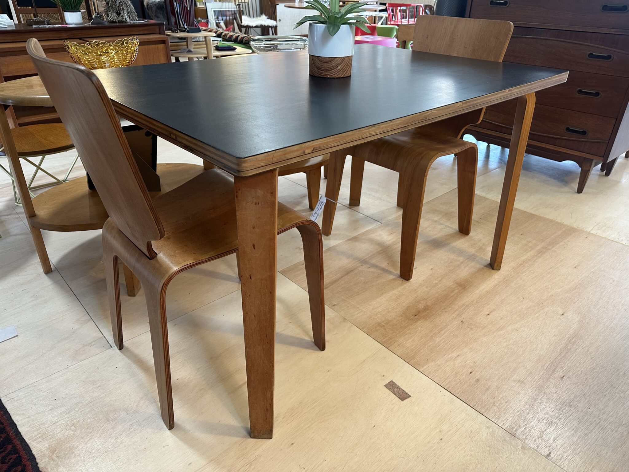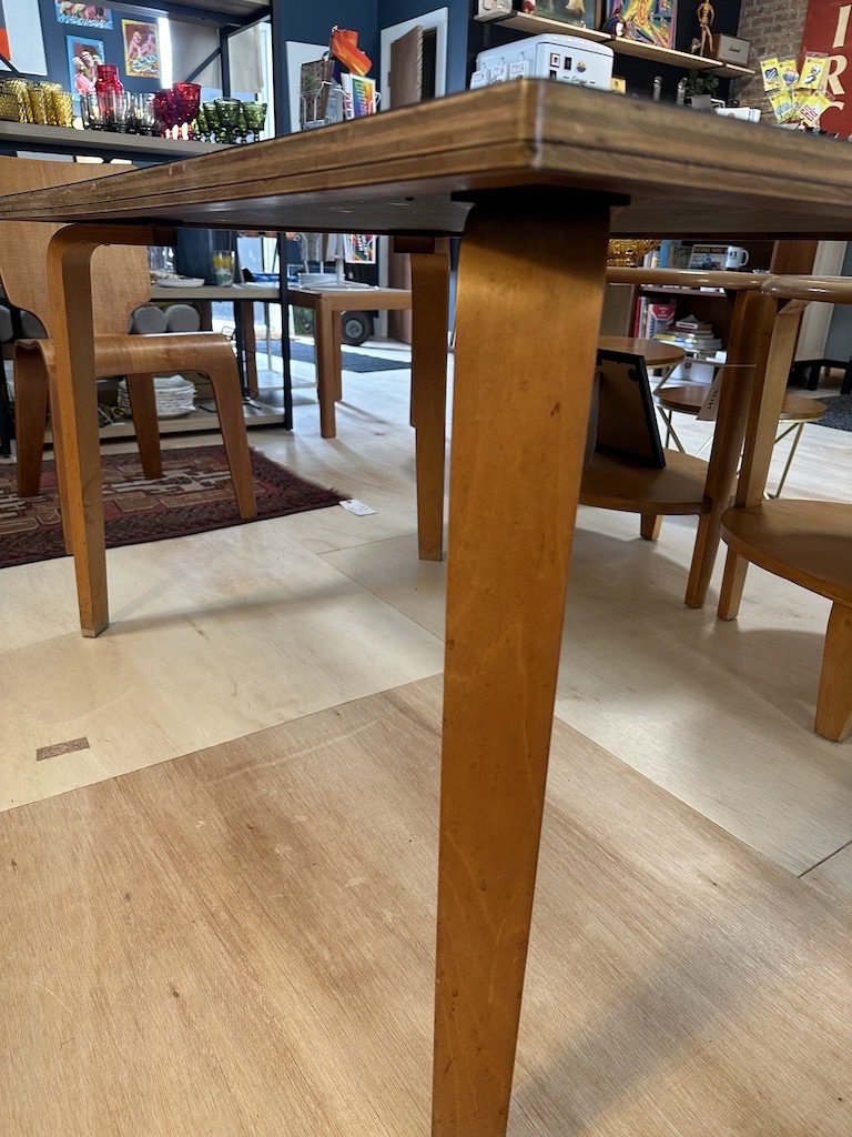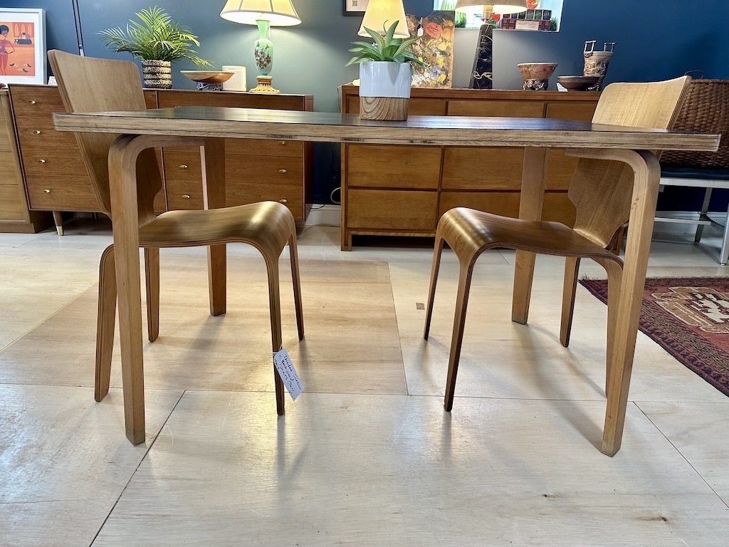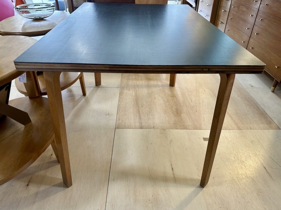 Features bent plywood legs and you can see the layers of plywood around the edges of the table, on the side.