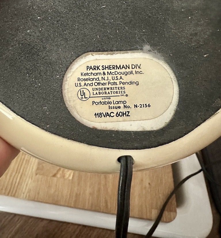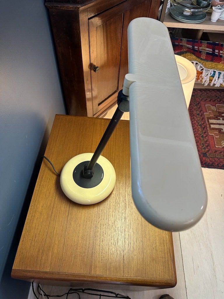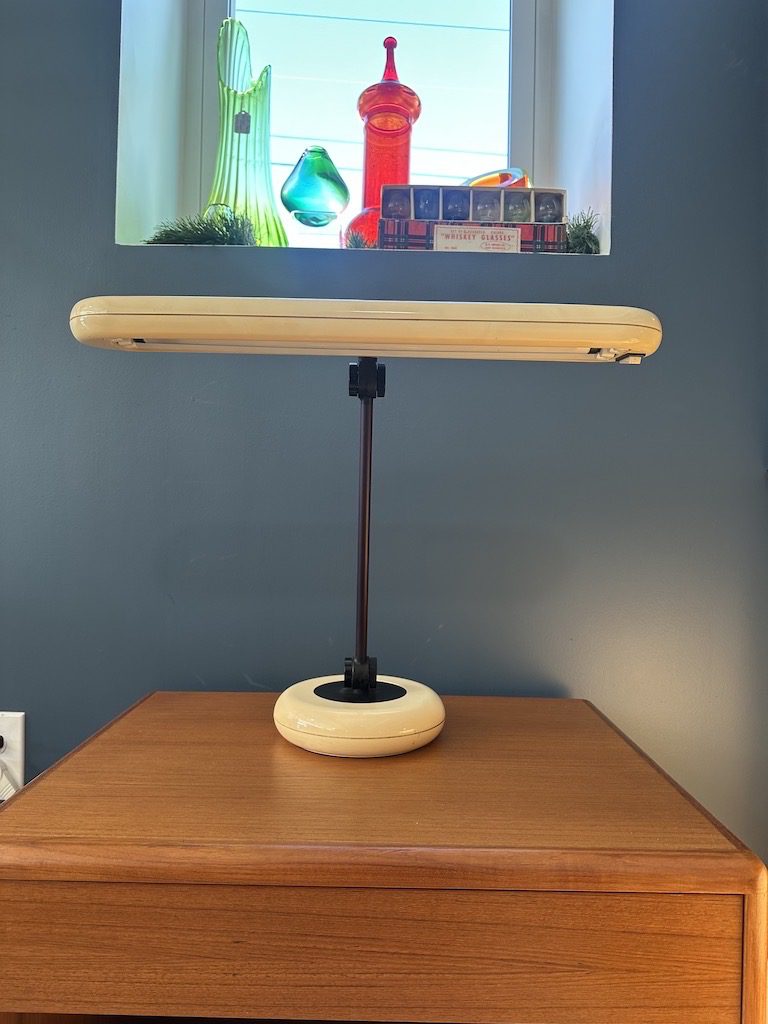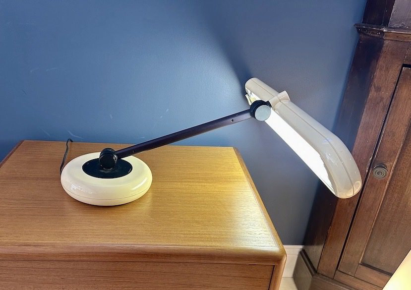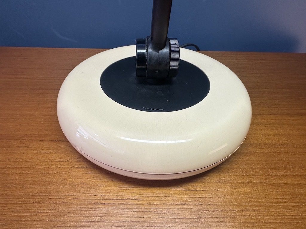 A vintage 1970s space age Park Sherman fluorescent desk lamp with tan molded plastic shade, weighted tan plastic base, black metal stem, and black accents. Works great and three pivot points allow adjustment in any direction.