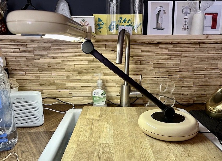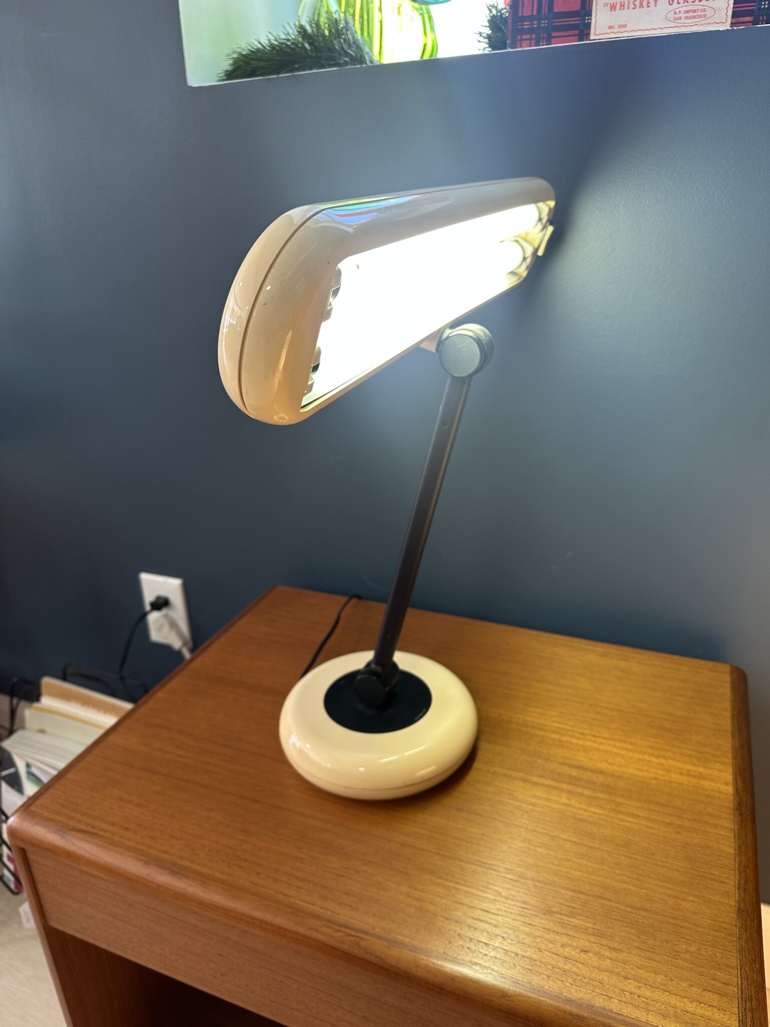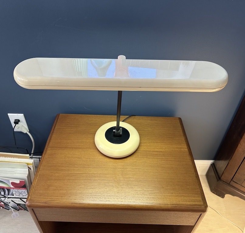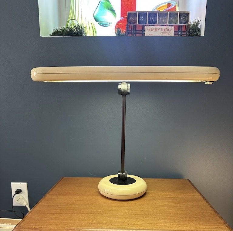 A vintage 1970s space age Park Sherman fluorescent desk lamp with tan molded plastic shade, weighted tan plastic base, black metal stem, and black accents. Works great and three pivot points allow adjustment in any direction.