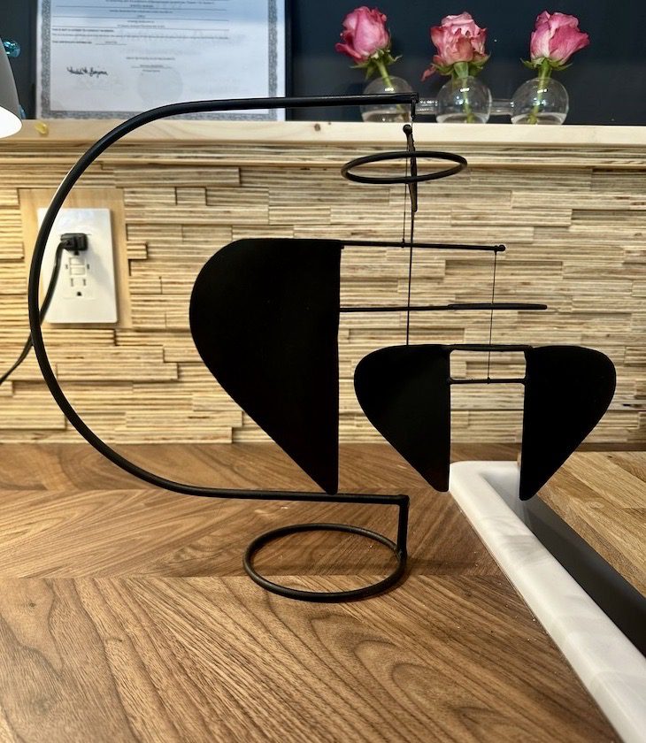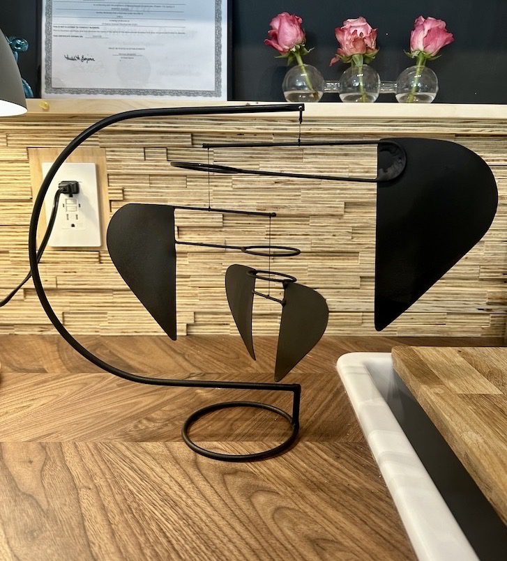 “I believe mobiles add an energy and aesthetic quality to interior living spaces. The viewer either directly or subliminally picks up on the balance and movement that is occurring in mid air above their heads. They are like a companion that performs in time and space and effortlessly moves… requiring no energy source besides the soft wafts of air that pass through a room.”