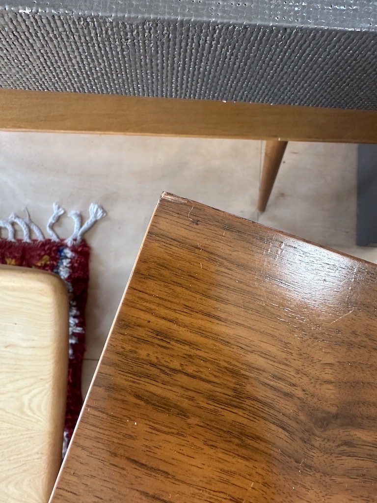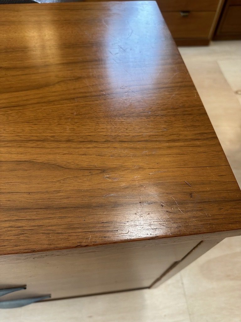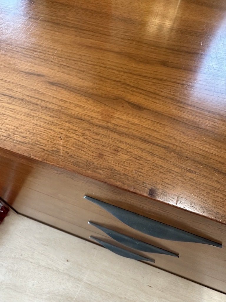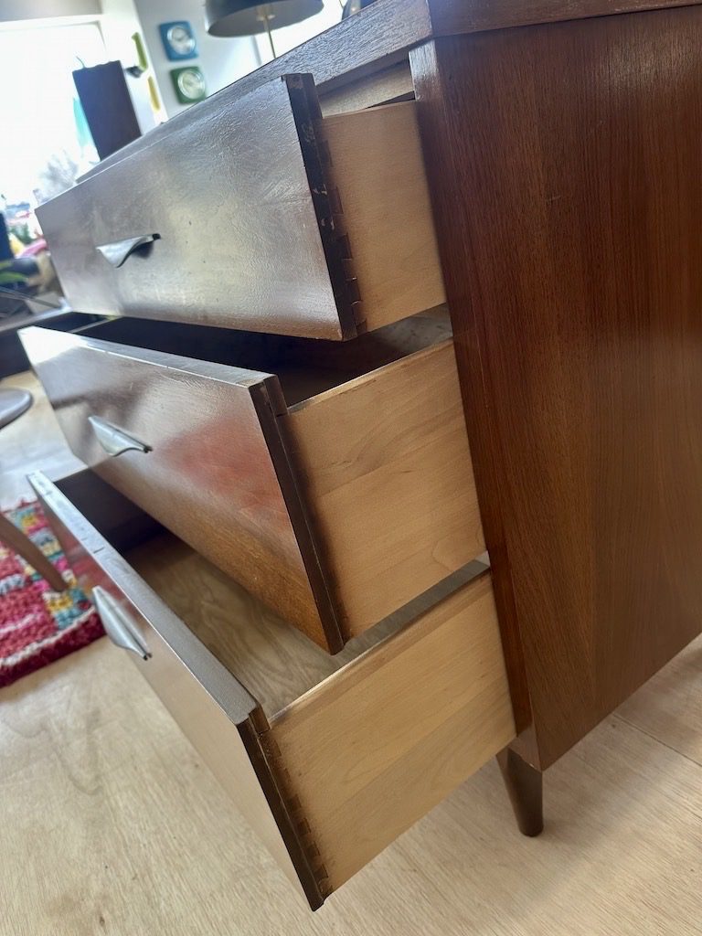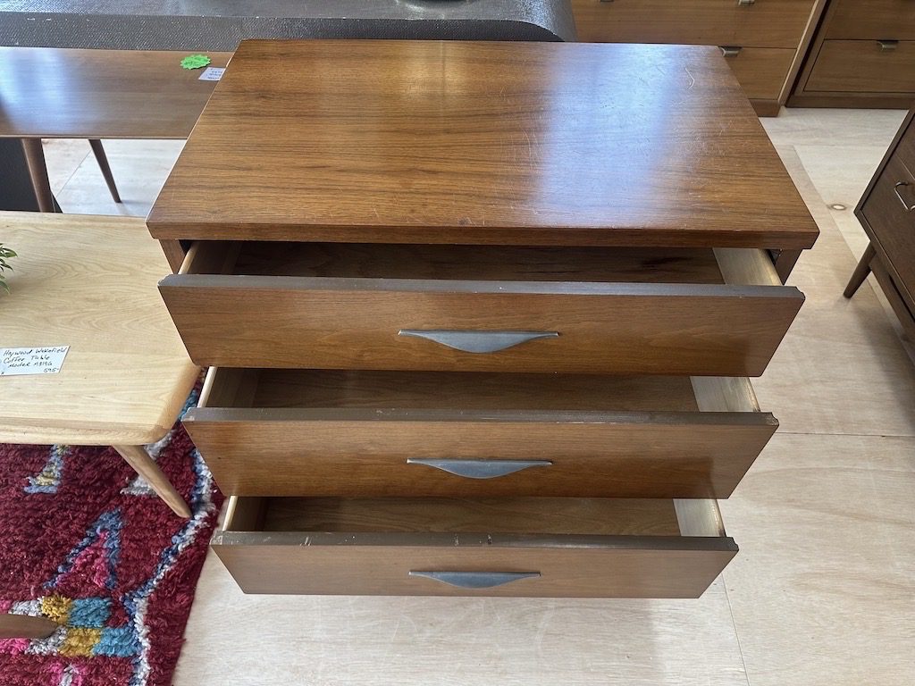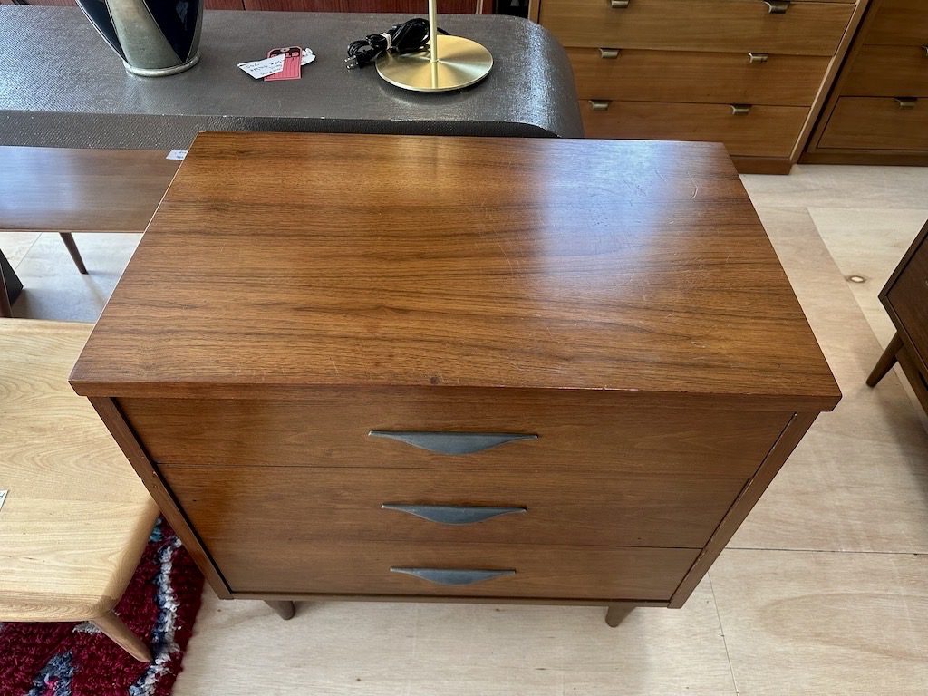 Smaller sized dresser with 3 drawers from the 1960s. Has drawer pulls similar to Jens Risom pieces.