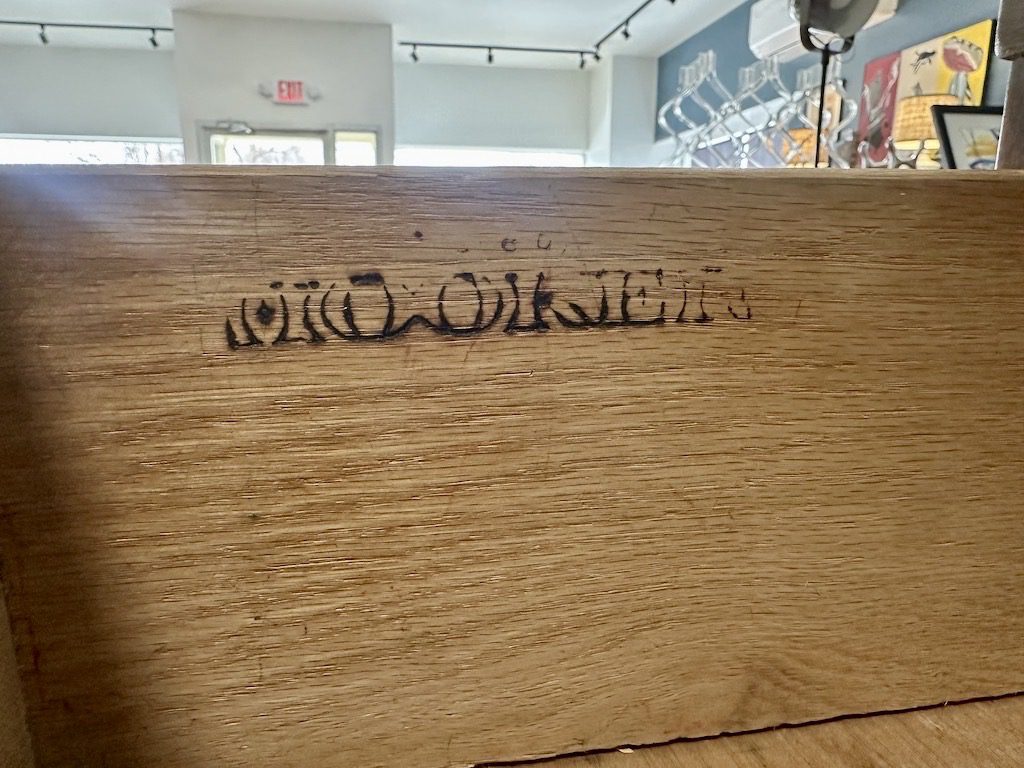 Stamped inside top drawer. Dovetailed drawer construction.