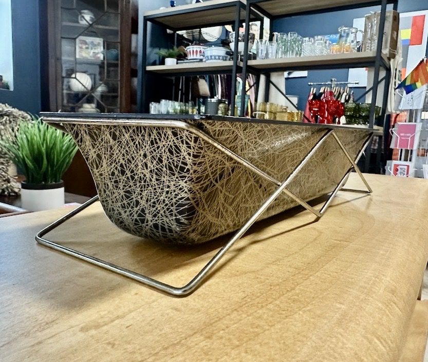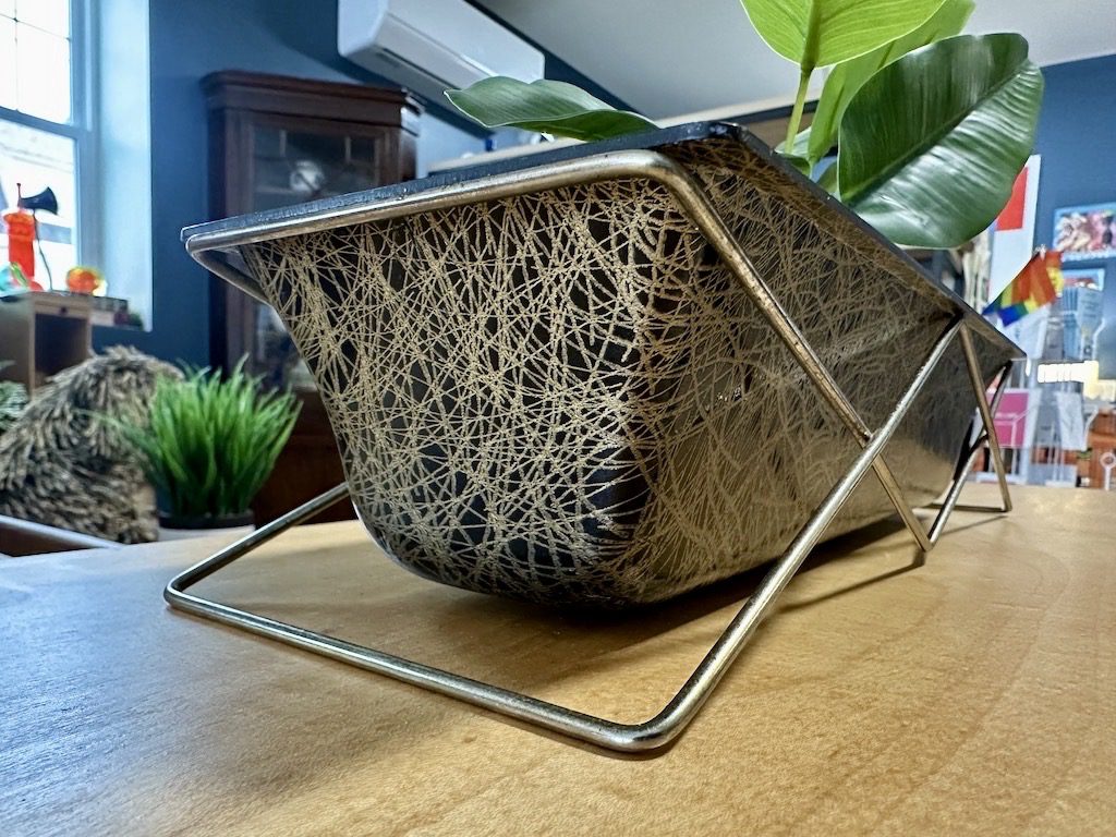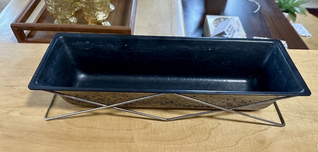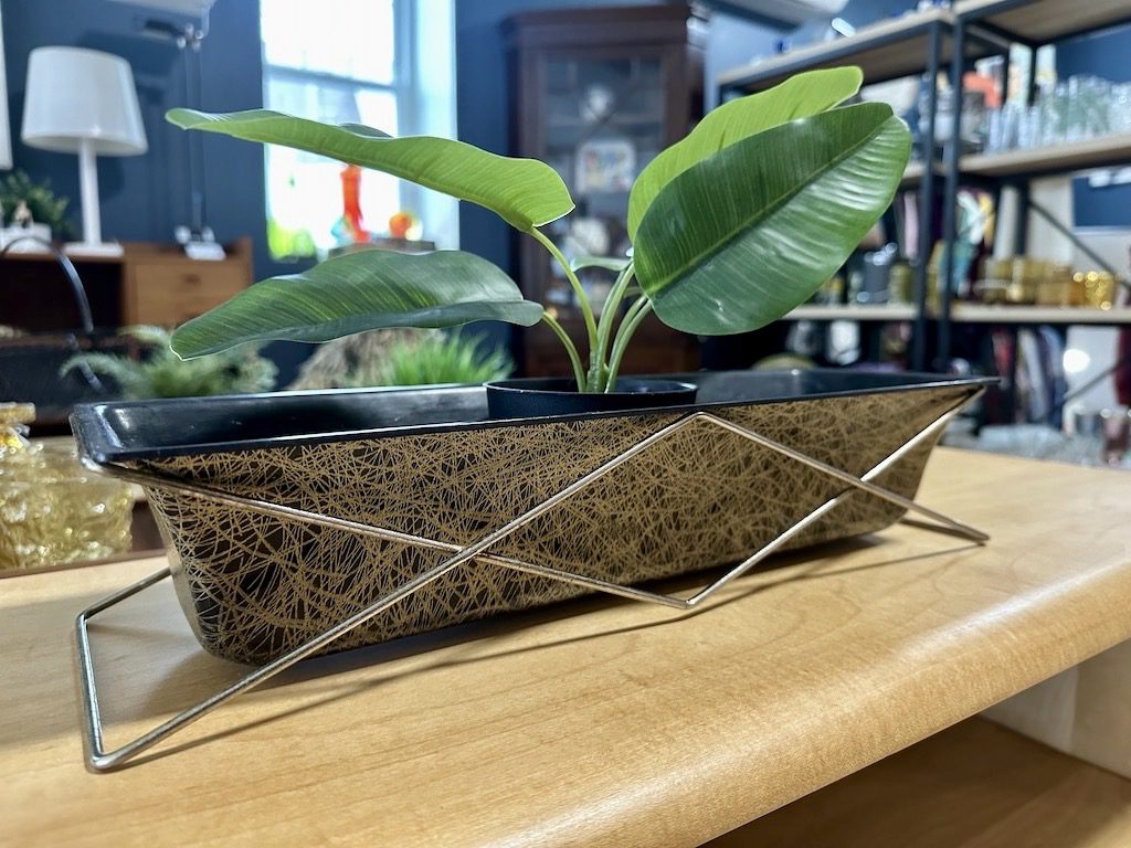 1950s molded fiberglass planter in black with texturized gold squiggle design. Sits inside of a wire stand.