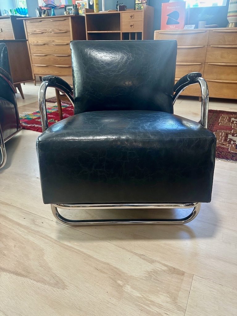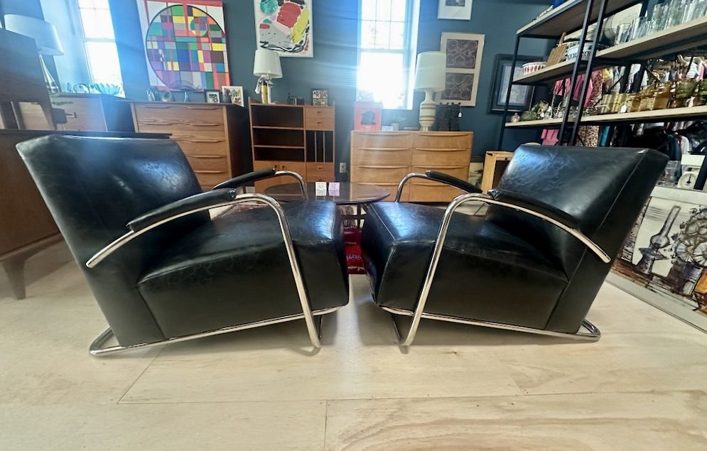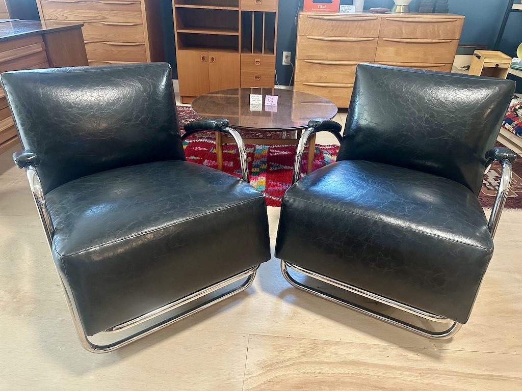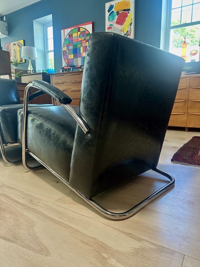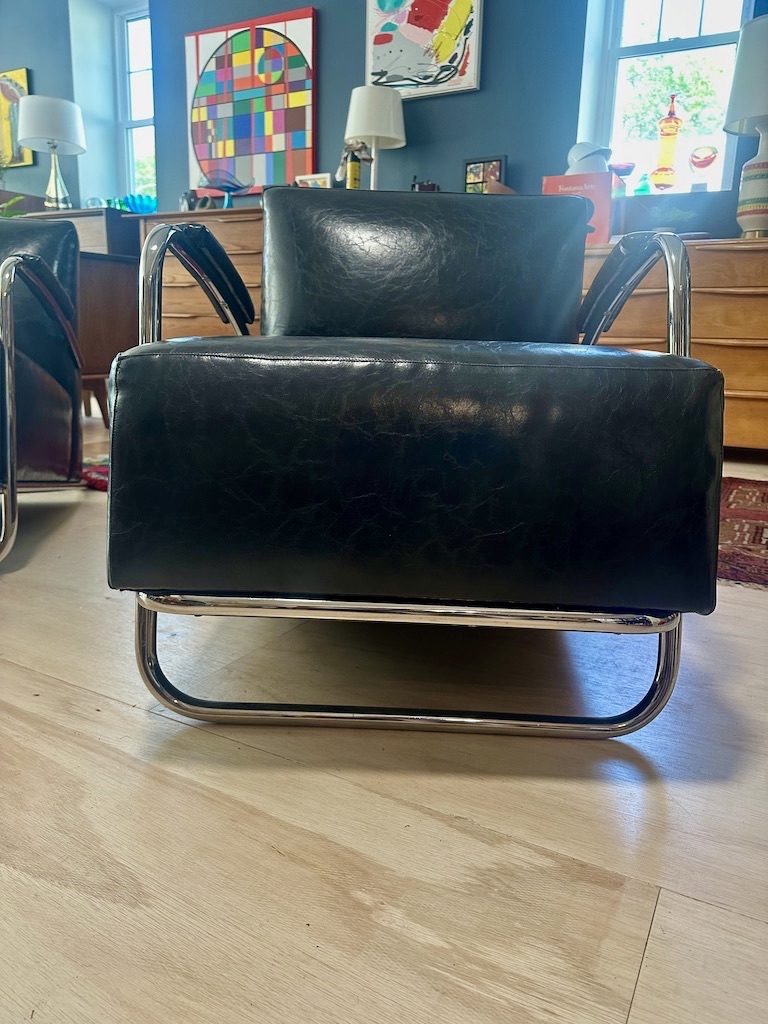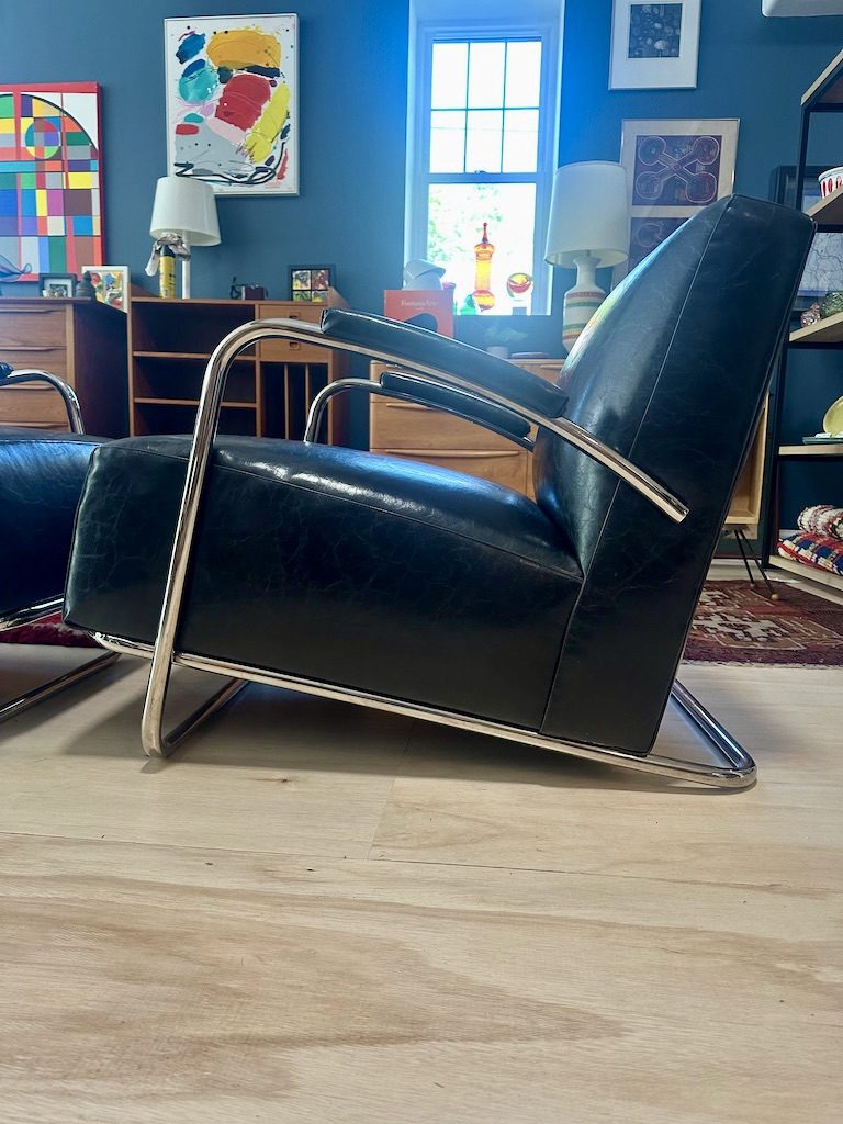 / Pair of Art Deco Inspired Chrome & Leather Chairs