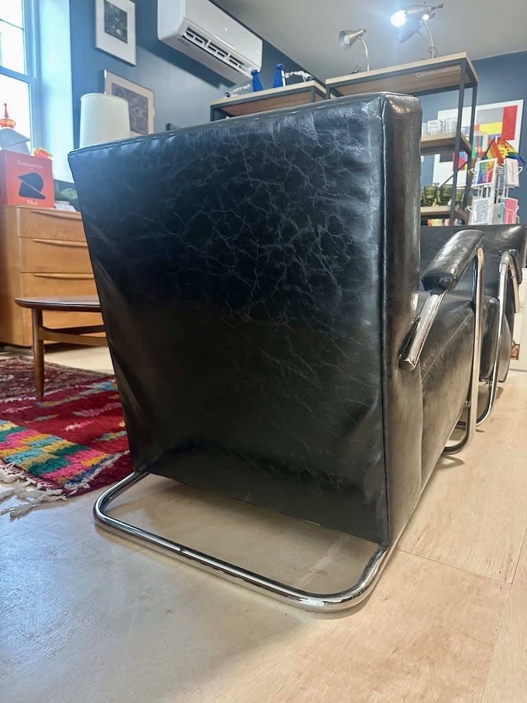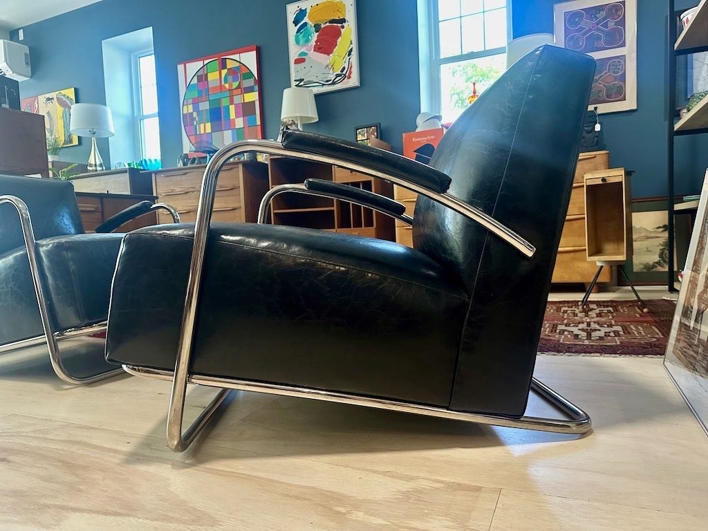 A vintage pair of Art Deco inspired club lounge chairs in black leather and tubular chrome.