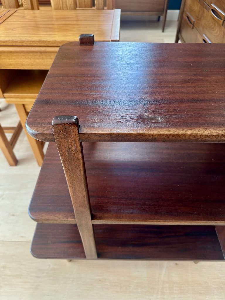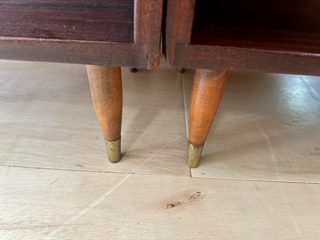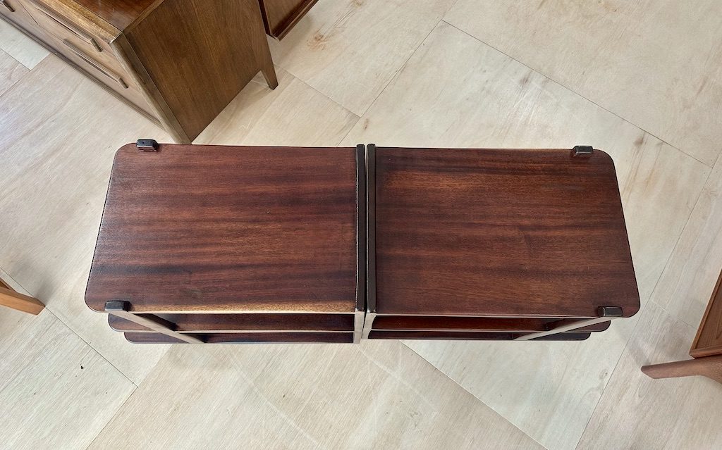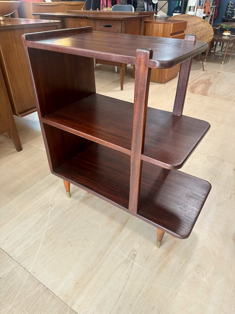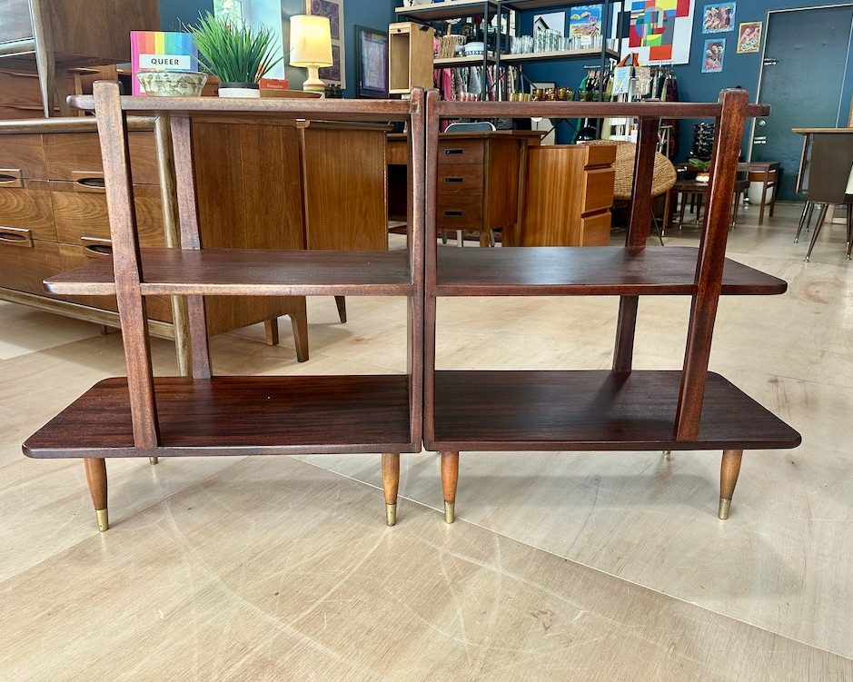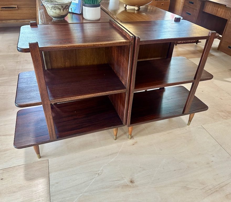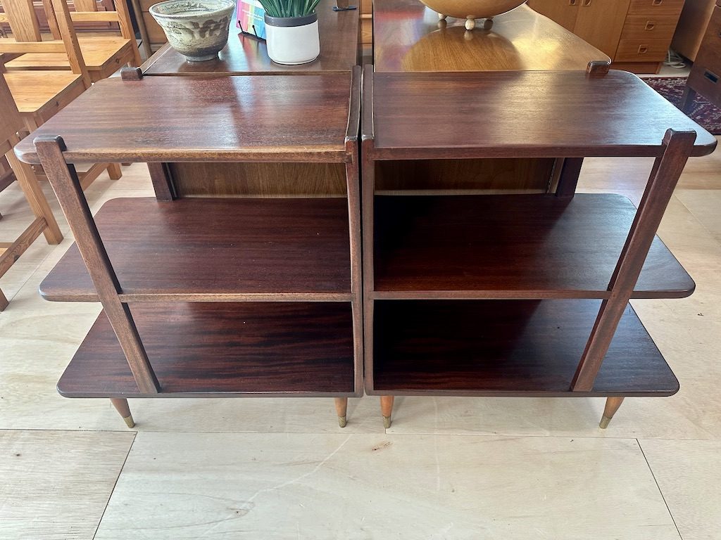 Really unique mahogany side tables with three tiers and tapered brass capped legs. 1950s vintage. These have been recently refinished. Great for books, collectibles, bed side tables, end tables, tv stand when put together, etc.