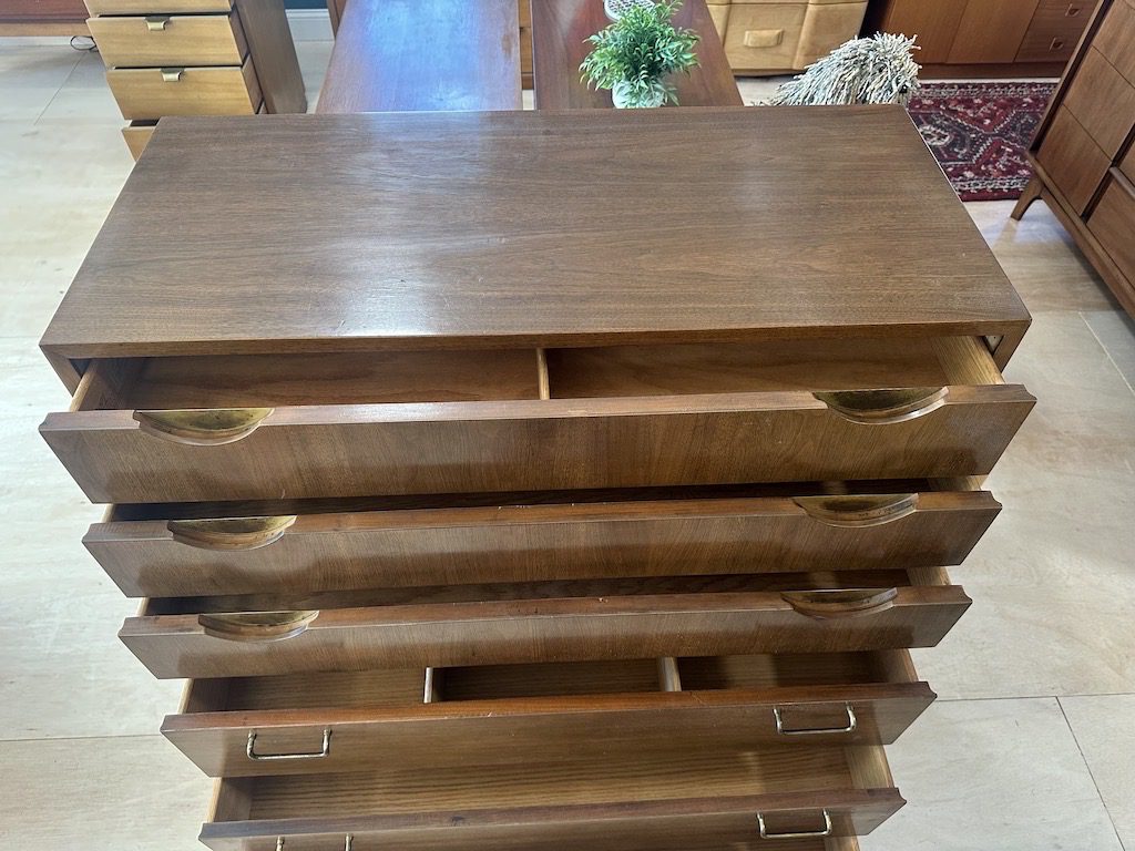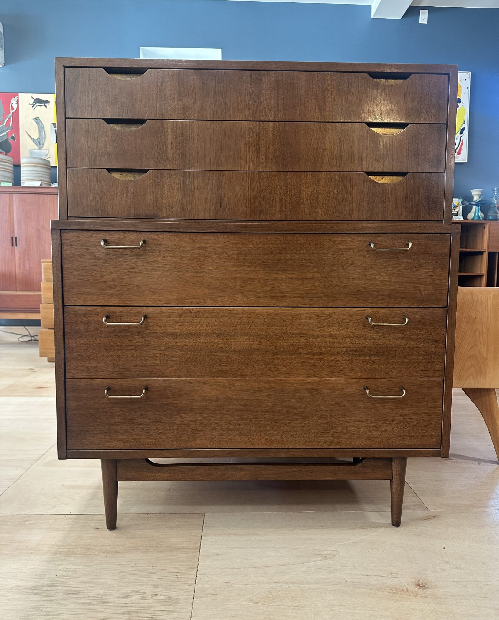 This stunning highboy chest of drawers comes from American of Martinsville’s Dania line, designed by Merton Gershun. It is a rare model that features inset half-moon pulls on its top three drawers. These pulls are lined in a brassy tone that coordinates with the solid brass pulls on the lower three drawers.
