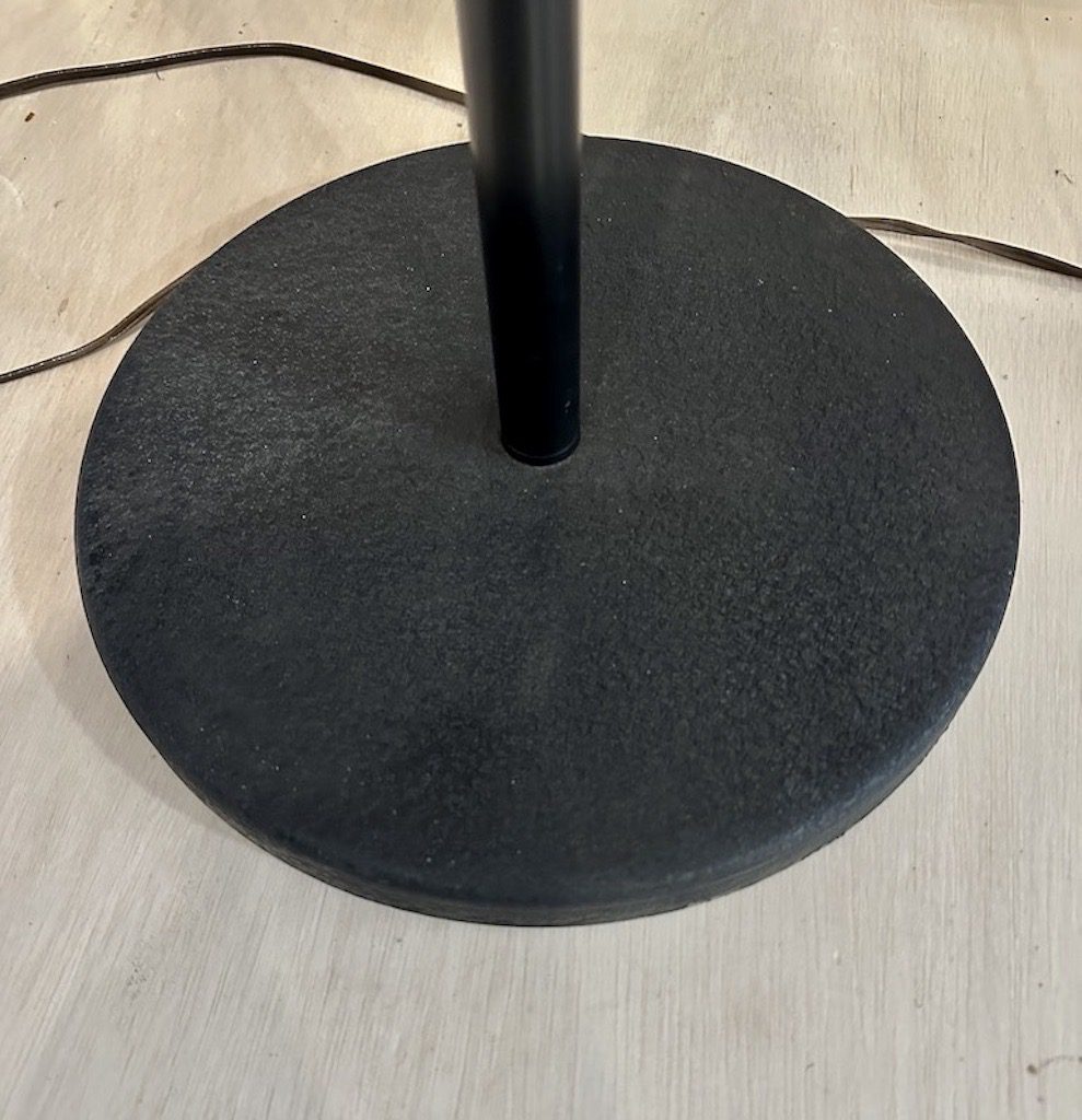 Black metal base. Two heads work but one will need a new switch. We reduced the price accordingly. We recommend having all vintage wiring replaced by a professional.
