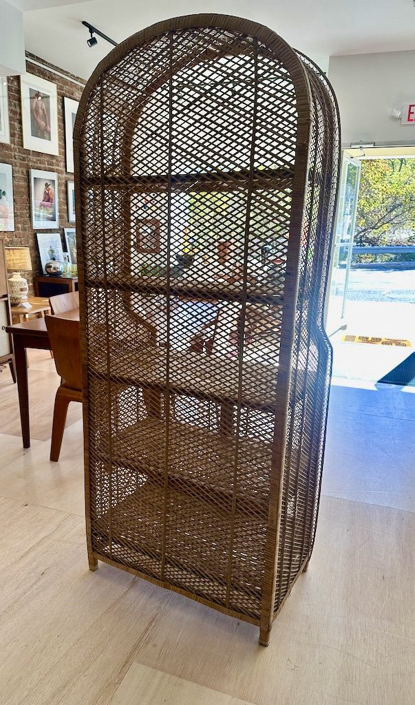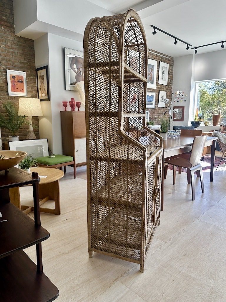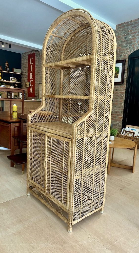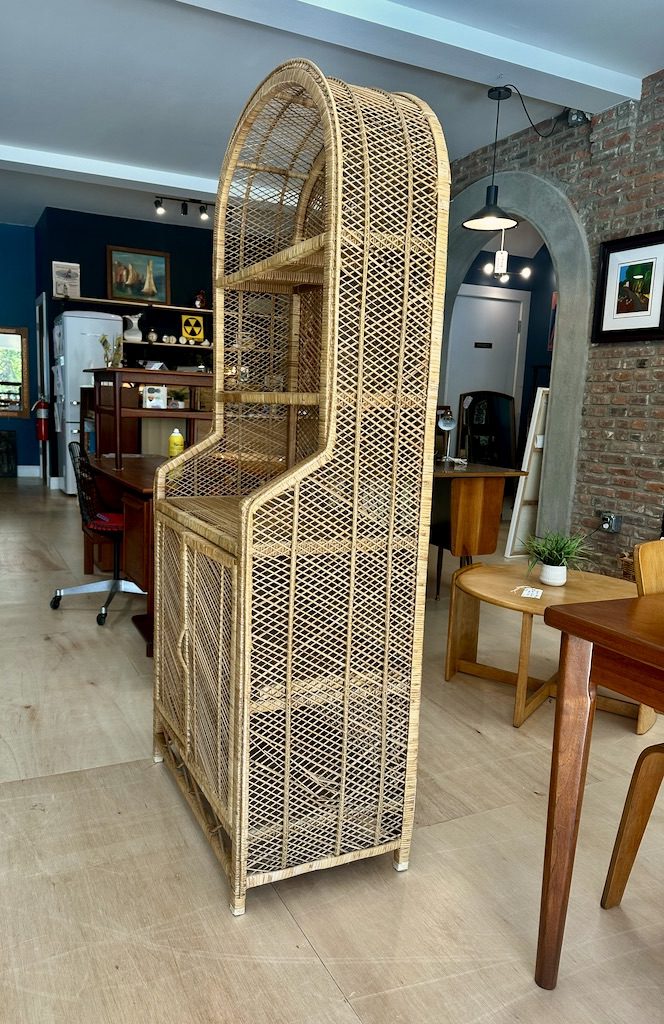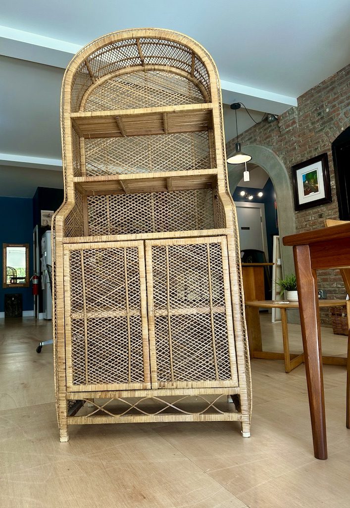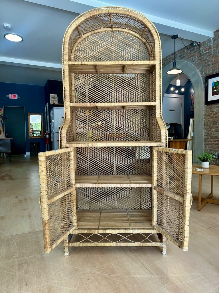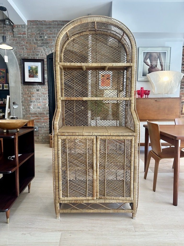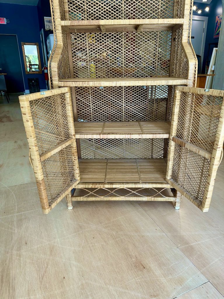 Nice 1970s Wicker /Rattan shelving unit / etagere’. 2 upper shelves and a single shelf in lower section behind doors.